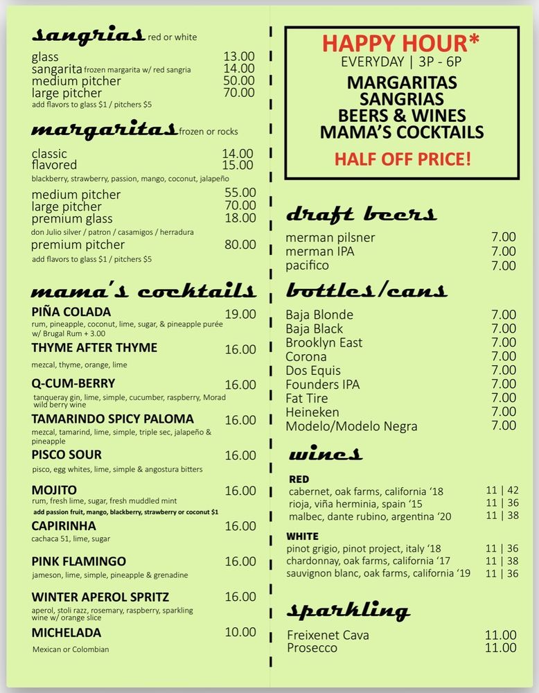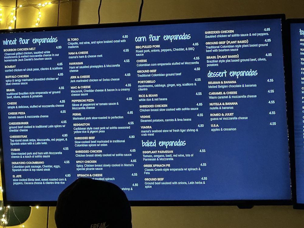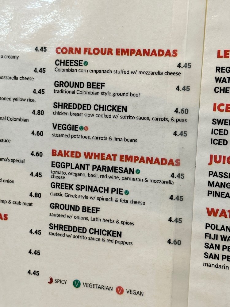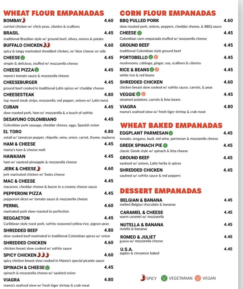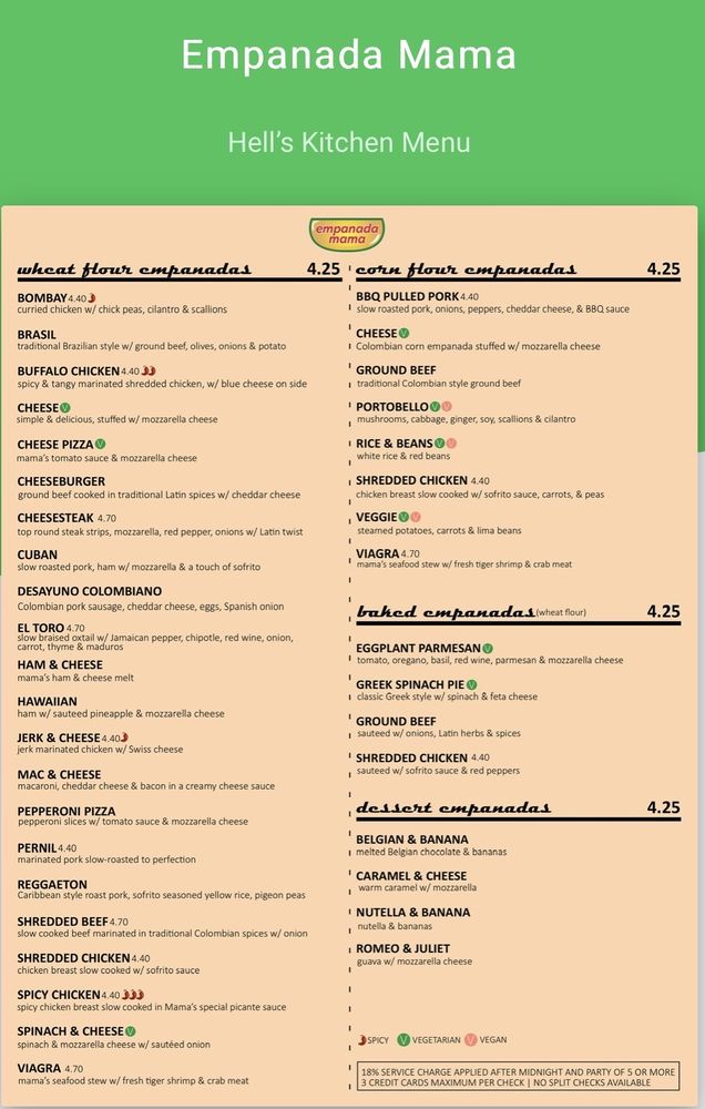 Introducing the menu at Empanada Mama - Hell’s Kitchen, a casual yet classy spot in New York City offering a variety of empanadas with unique fillings like cheeseburger, BBQ pulled pork, and Indian curry. Along with traditional options like basil and Colombian, the menu caters to different dietary needs with vegan and vegetarian choices. Customers rave about the flavorful empanadas, especially the oxtail and spicy chicken ones. Prices are reasonable, ranging from $4 to $6 per empanada. The restaurant provides a comfortable dining experience with attentive service and a diverse selection of dishes. Whether you're looking for a quick snack or a satisfying meal, Empanada Mama is a must-visit spot for delicious Latin-inspired cuisine.